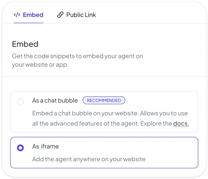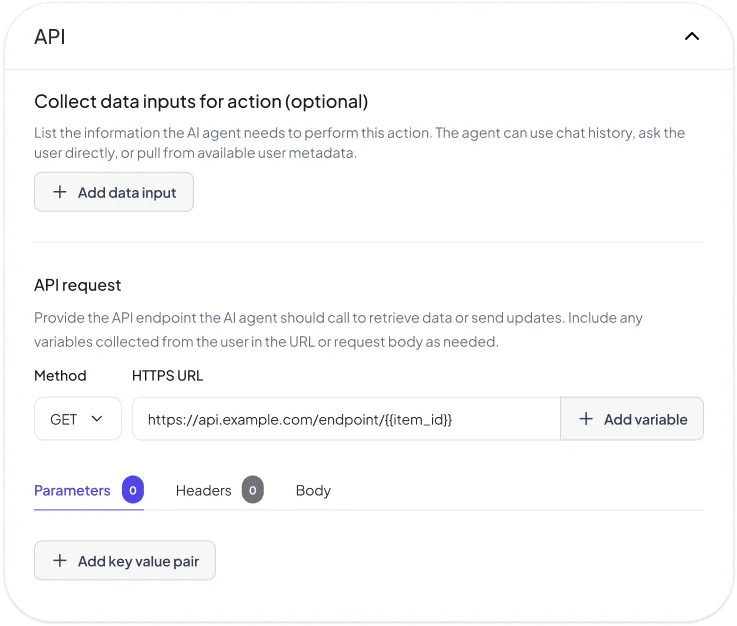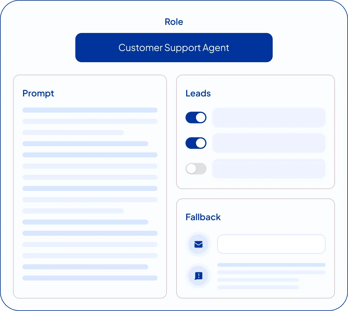 Define your agent’s skills with configurable tool calls — APIs, CRMs, databases, and more.